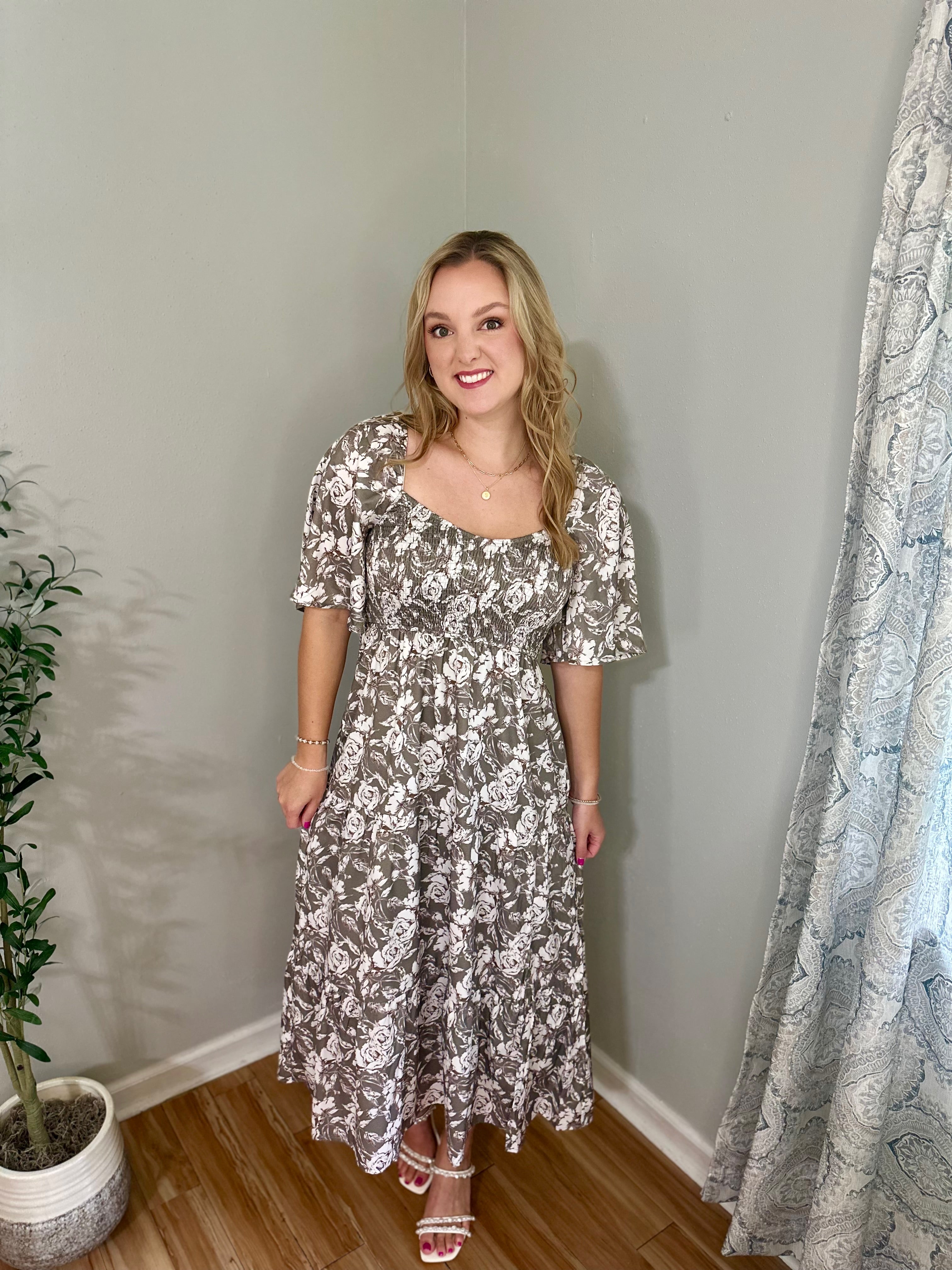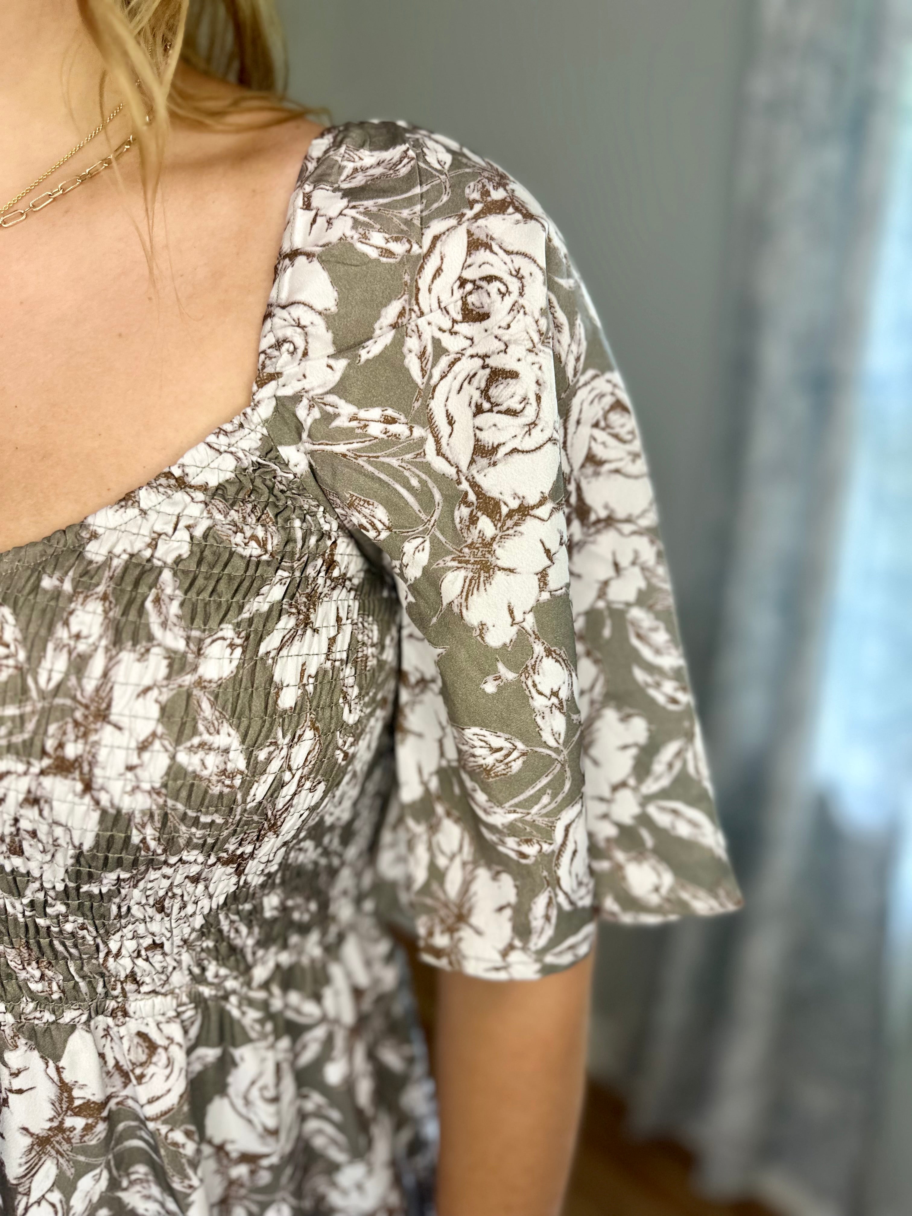 This dress has it all - an eye-catching olive background adorned with delicate white florals, flutter sleeves for a feminine touch, a smocked bodice for a flattering fit, and a sassy side slit. Complete with lining and side pockets. An effortless way to make a statement at any occasion.