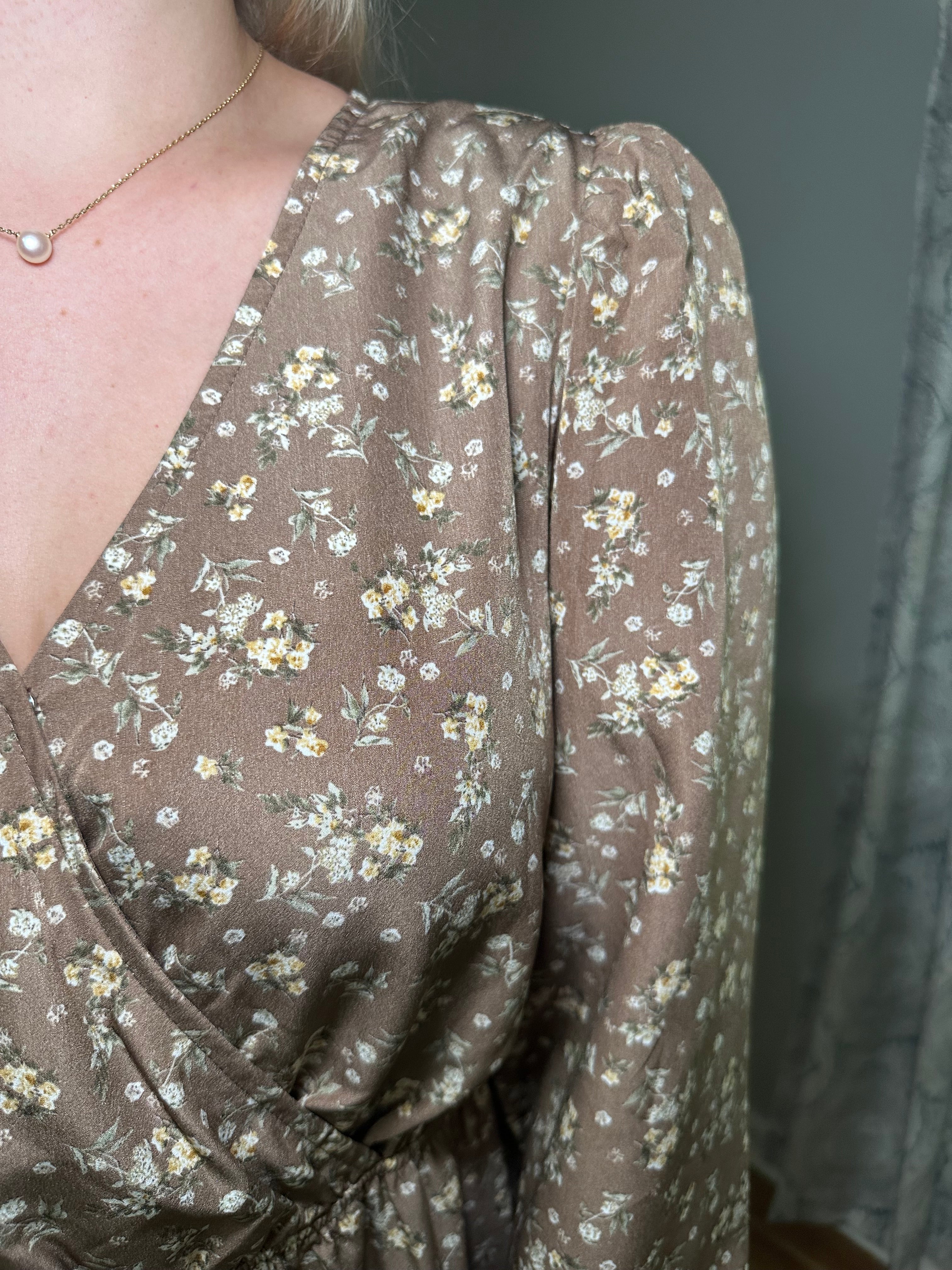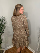 Earthy, effortless, and endlessly charming — this dress brings a touch of countryside romance to your wardrobe. With its soft taupe hue and delicate ivory floral print, this tiered silhouette flatters every figure while keeping you comfortable all day long. The ruched waistline and flowy sleeves add just the right amount of feminine detail, while the modest length — hitting just above the knee — keeps it perfectly versatile for any occasion.