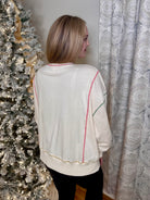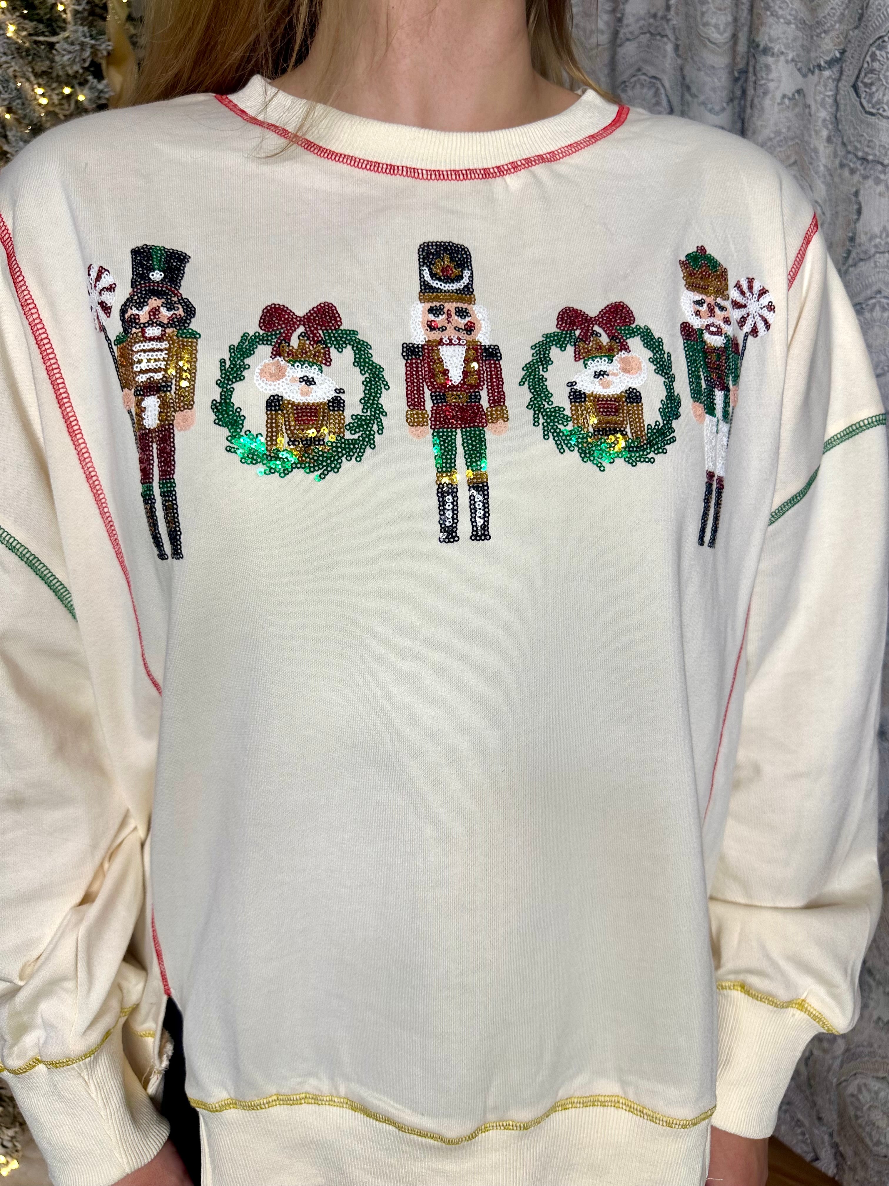 Step into the season with this charming holiday pullover featuring sequin-detailed nutcrackers and festive wreaths across the front. The soft cream base, contrast stitching, and relaxed silhouette give it that cozy-cute look you’ll want to wear all December long.