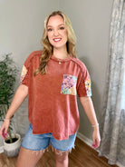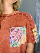 Add some blooming style to your wardrobe with our Wildflower Rust Tee! This unique t-shirt features a playful patchwork of multicolored floral designs on a warm rust-colored background. Perfect for adding a touch of fun and color to any outfit.