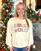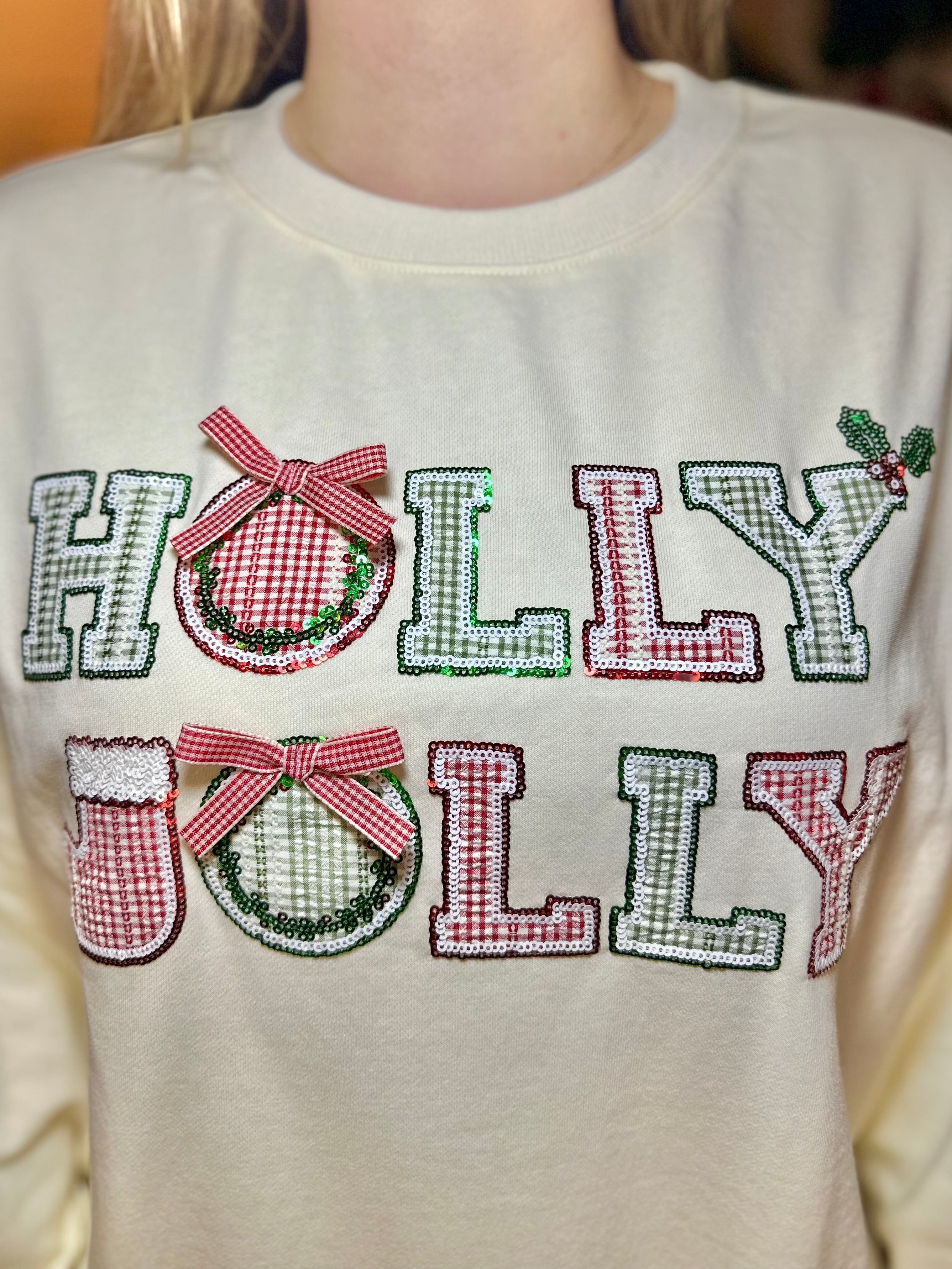 Bring the holiday cheer everywhere you go with this super fun and festive “Holly Jolly” cream colored sweatshirt! Each letter has its own Christmas flair - adorable gingham patterns, wreath detail, and sweet ribbon accents that give this top so much personality.